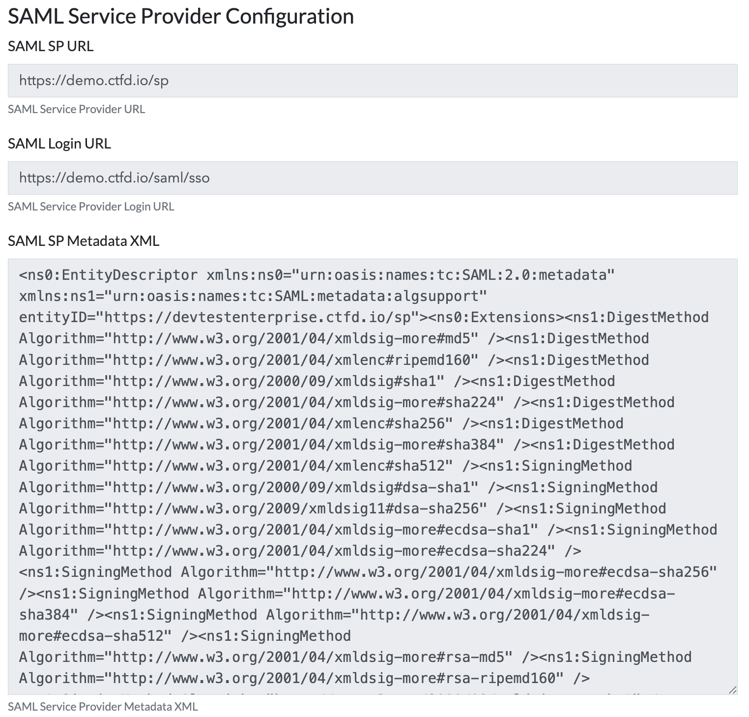 You will receive an IdP Metadata XML or IdP Metadata URL from your SAML software which you will need to put into the SAML plugin in CTFd.